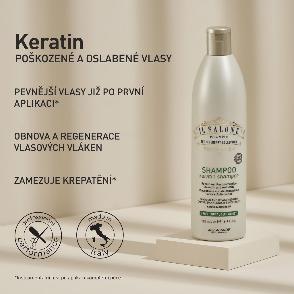 | Primární aktivní složky: | KERATIN "posilují a regenerují vlasy", MANDLOVÝ OLEJ "uhlazuje vlasy, dodává lesk a vyživuje pokožku hlavy" |