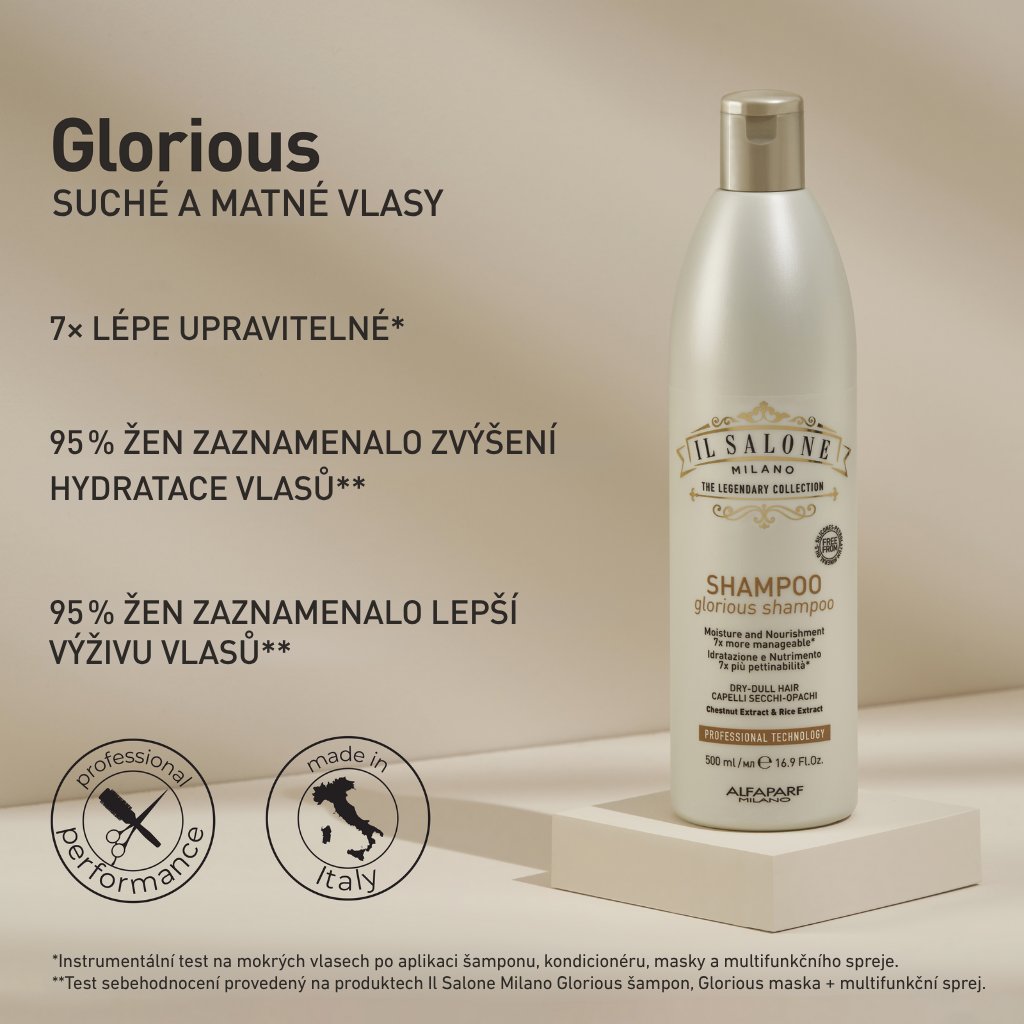 Naneste na vlhké vlasy. Masírujete. Opláchněte. V případě potřeby opakujte. Následujte Glorious Conditioner nebo Glorious Mask.